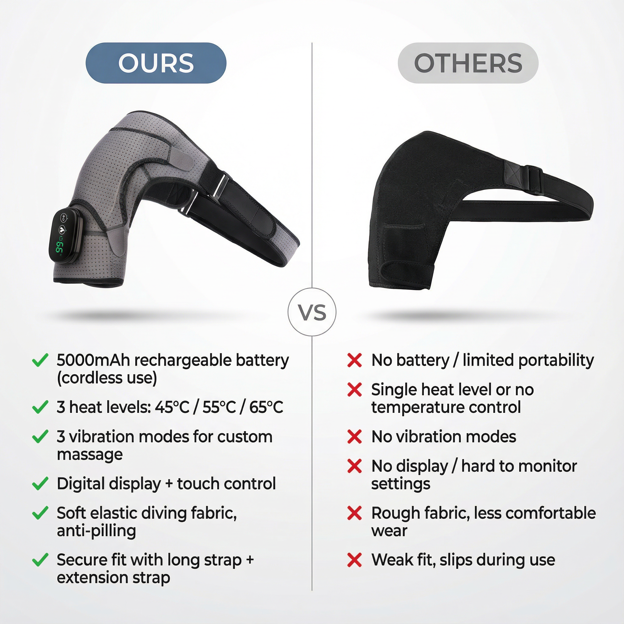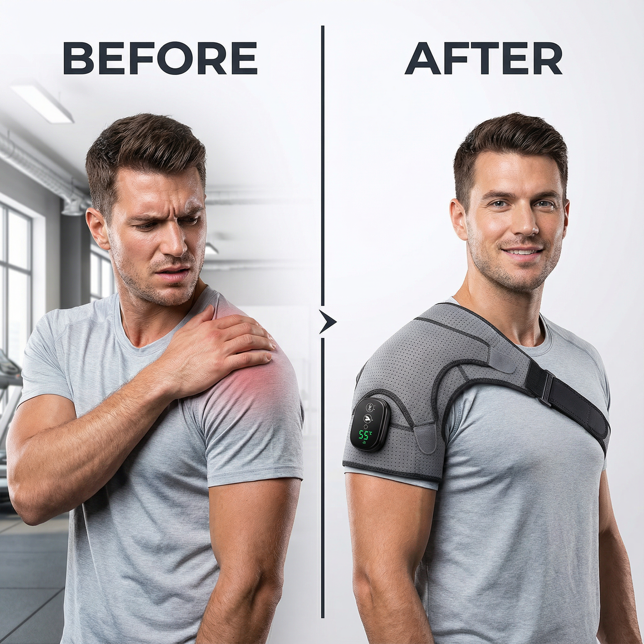 Whether you’re dealing with stiffness from long hours at a desk, recovering from a workout, or managing chronic shoulder discomfort, ThermaRelief™ Heated Shoulder Massager gives you soothing heat and vibration exactly where you need it – without bulky devices or messy cords.